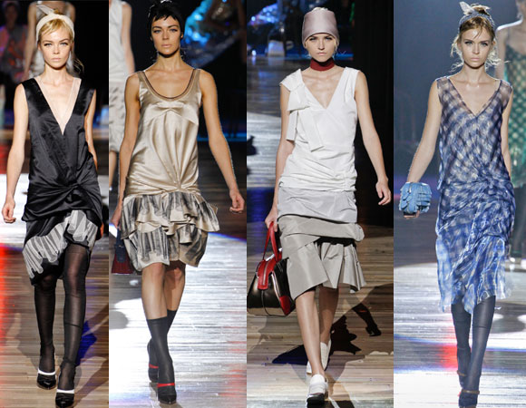 Além da ansiedade de ver mais uma coleção ser desfilada, atribuo tudo isso à incrível habilidade do Marc de trazer o drama para a passarela em um espetáculo diferente e carregado a cada temporada. Ontem não foi diferente: o cenário que de cara me remeteu a um palco, a trilha de Philip Glass , tudo contribuiu para apresentar uma coleção que trouxe muitas tendências mas não me soou nada repetitiva. Teve o boudouir com lingeries aparecendo por baixo de vestidos transparentes, teve a camisa abotoadinha, transparências… Mas tudo mostrado de outra forma. Por exemplo: o desfile veio bem carregado de referências dos anos 20, com tecidos bem brilhosos e meias de tule – que, aliás, me lembraram muito o desfile da Extra inspirado em bailarinas.